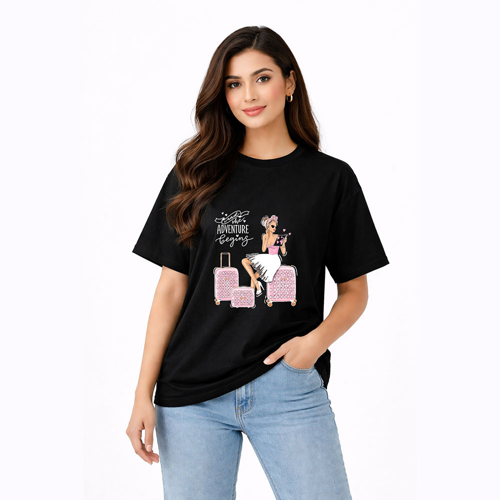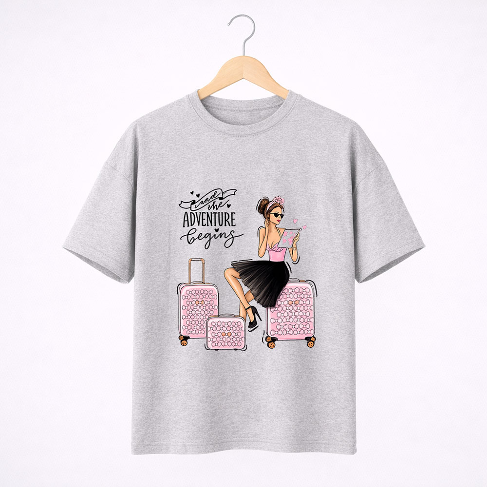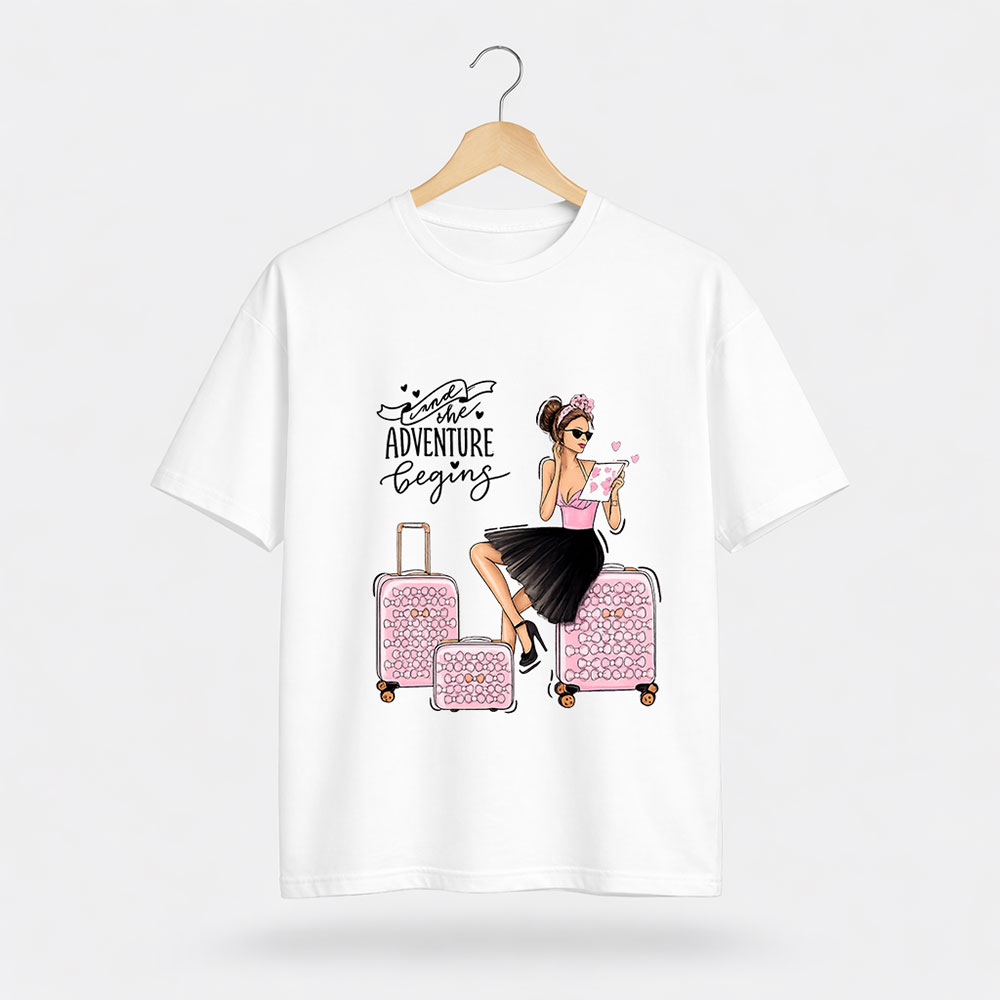 Adventure Begins Travel Girl Graphic T-Shirt – Premium DTF Printed Design