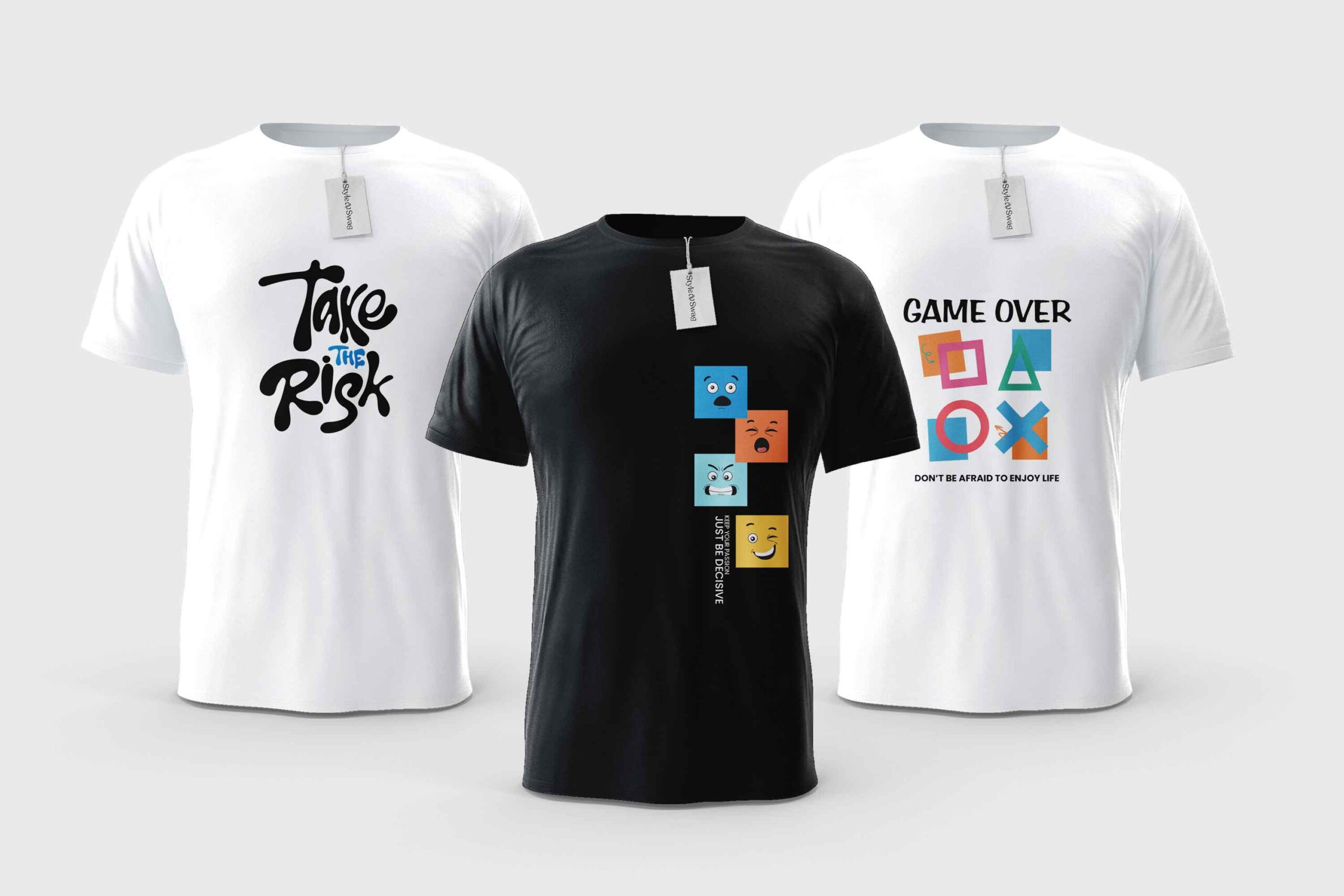 The Pack of 3 Graphic T-Shirts brings together bold typography, gaming-inspired visuals, and modern streetwear graphics in one stylish combo. Each t-shirt features a unique design including Take the Risk, Game Over, and a playful emoji graphic that adds personality and attitude to your everyday look.